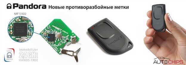Управление Пандора 3910 производится с помощью миниатюрных противоразбойных меток 2,4GHz, оснащённых кнопкой управления режимом охраны.