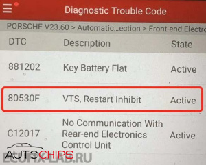 Также в случае если на автомобиль попытались установить задний б.у. блок от автомобиля с VTS, активируется защита и автомобиль перестает заводиться, для исправления этой проблемы VTS исключается из комплектации Porsche переднего BCM.